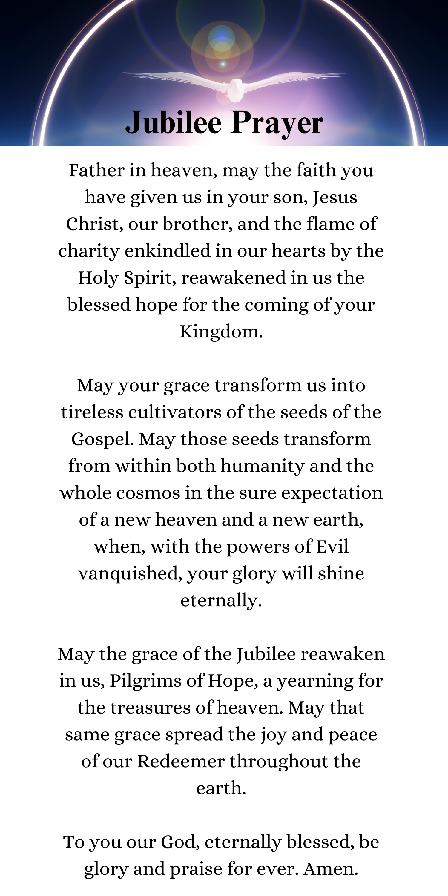 May the grace of the Jubilee reawaken in us, Pilgrims of Hope, a yearning for the treasures of heaven. May that same grace spread the joy and peace of our Redeemer throughout the earth.